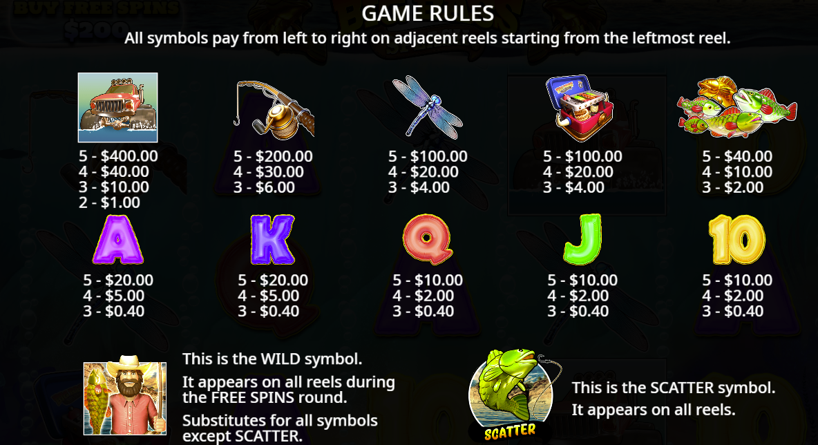 • Scatter Symbol Hooked Bass / Fish Scatter: Landing 3 or more scatters anywhere triggers the Free Spins feature. :contentReference[oaicite:10]{index=10}